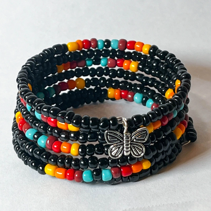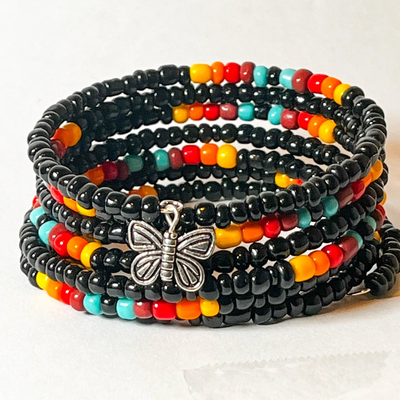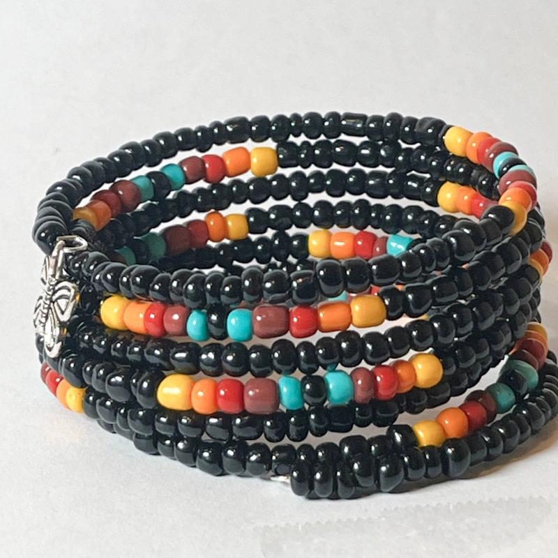 Made of beads and wire. 7 loops multi color beads memory wire bracelet. This handcrafted beaded bracelet is an excellent accent piece for a casual outfit.