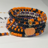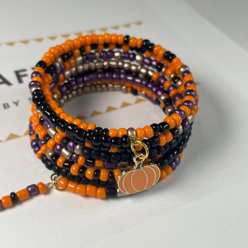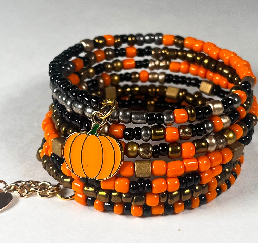 Celebrate the charm of fall with this handcrafted Halloween Memory Wire Bracelet, designed with a vibrant combination of orange, Black, Bronze and Silver seed beads. The 7 layer wrap bracelet features a playful enamel pumpkin charm that captures the spirit of Halloween and autumn.
